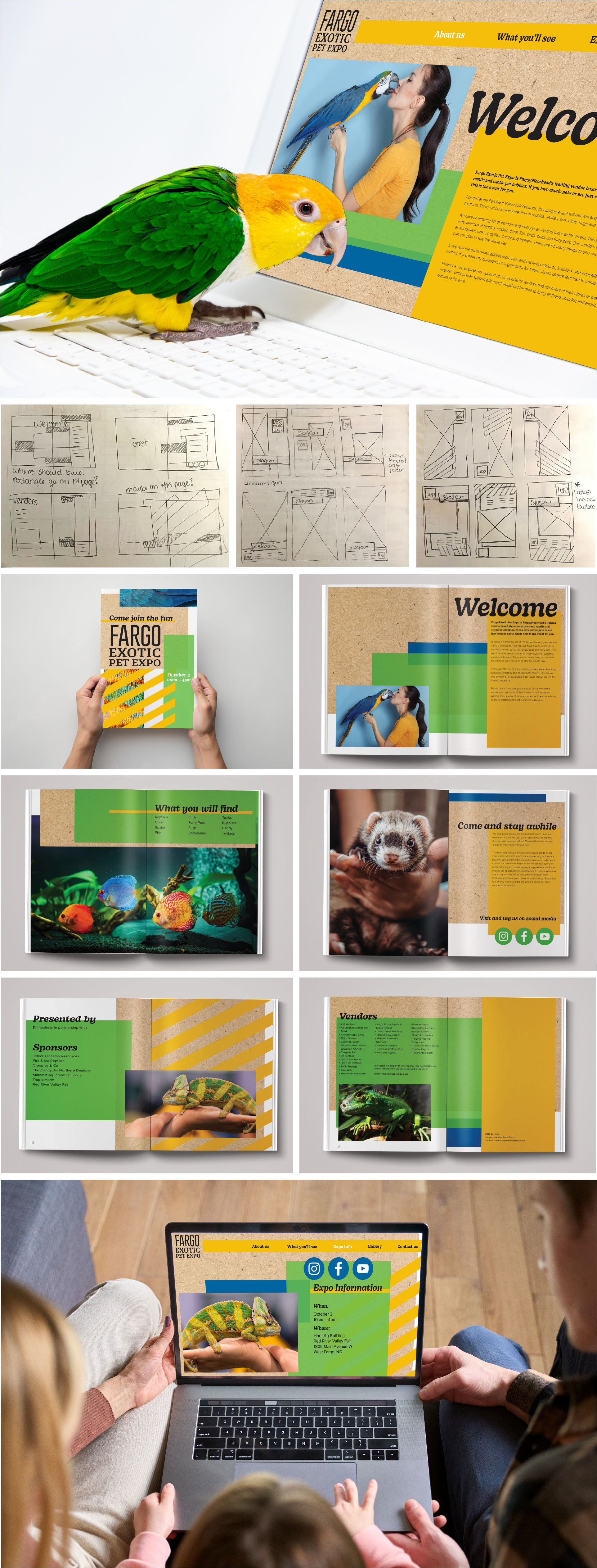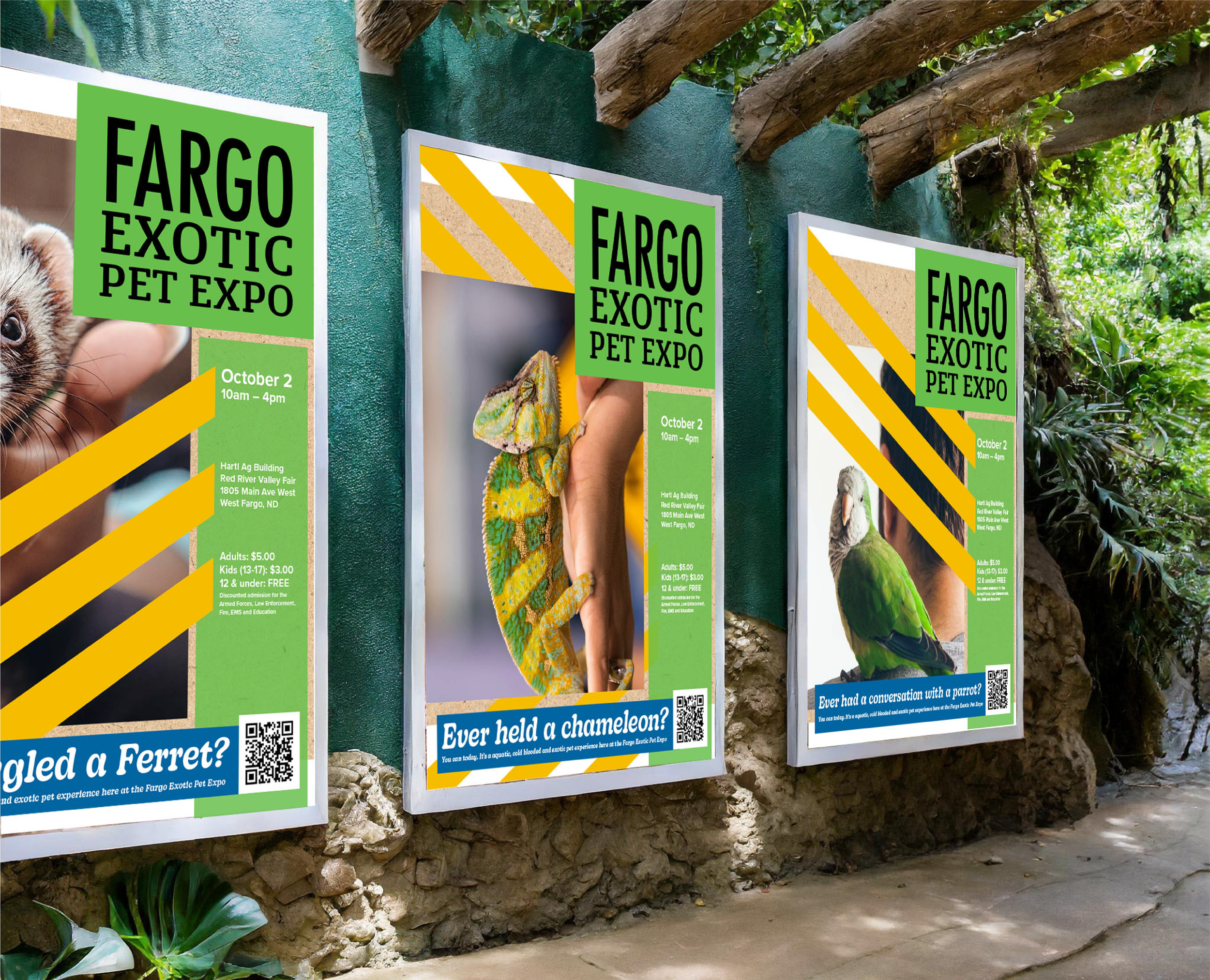 Description: The goal for this project was to identify a real-world example of signage with cluttered messaging and poor design. Using the information on the poster we were to envision and create new deliverables which included a poster series, website, and event booklet. I chose the Exotic Pet Expo, and annual event in Fargo, North Dakota.